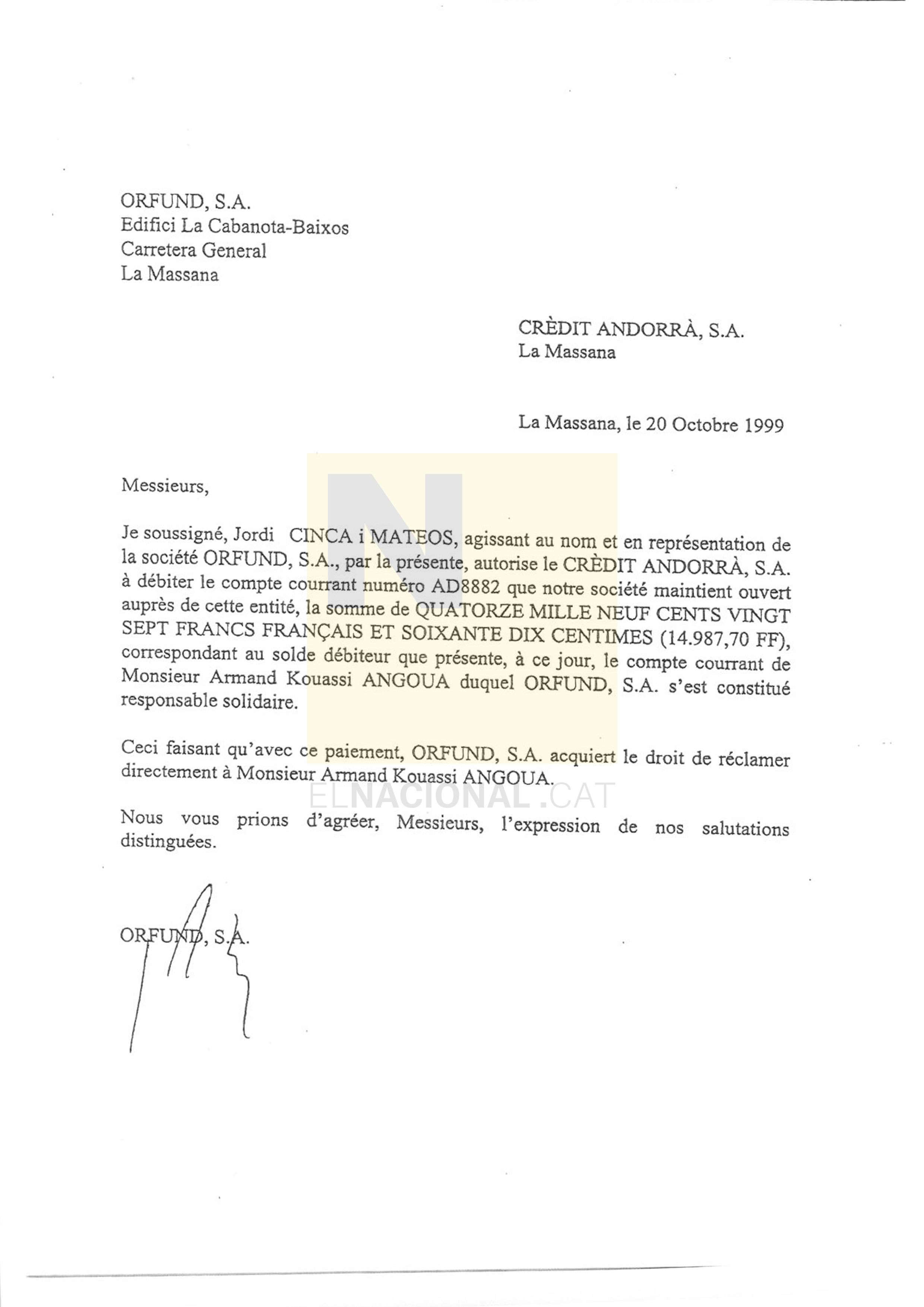 Carta de Crèdit Andorrà per formalitzar la transacció entre Cinca i Angoua