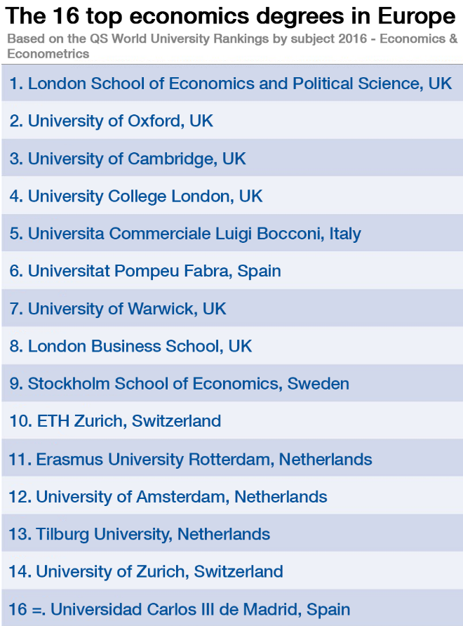 La Universitat Pompeu Fabra (UPF) és la sisena millor universitat d'Europa per estudiar Economia, la millor d'Espanya i la segona millor del sud d'Europa després de la Universita Commerciale Luigi Bocconi. Així ho constata un rànquing realitzat per l'organització internacional World Economic Forum que té en compte la reputació de la institució pel que fa el professorat, les publicacions i les cites de recerca. Més concretament, la UPF, que aconsegueix una puntuació de 80,1 punts, tan sols 10 menys que la prestigiosa London School of Economics, és una universitat "jove, pública i moderna". Va ser fundada el 1990 amb la ferma voluntat de convertir-se en "una universitat líder a Europa".