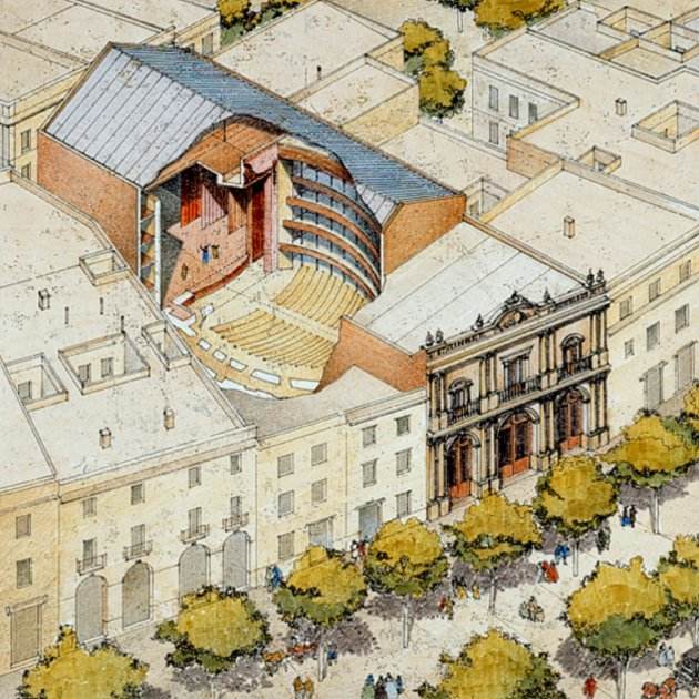 El Teatre de la Santa Creu va ser totalment refet després d’un gran incendi que va destruir la totalitat de l’edifici anterior (1787). Després d’aquell sinistre, les autoritats municipals de l’època van habilitar un edifici de representacions efímer, construït amb fusta i situat als voltants, mentre es duien a terme les obres de reconstrucció del teatre destruït per les flames (1787-1789). Posteriorment, el Teatre de la Santa Creu seria rebatejat com a Teatre Principal (1840) i novament reformat (1847) segons el projecte de l’arquitecte Francesc Daniel Molina i Casamajó (Vic, 1812 - Barcelona, 1867), autor del pla urbà i arquitectònic de la plaça Reial.