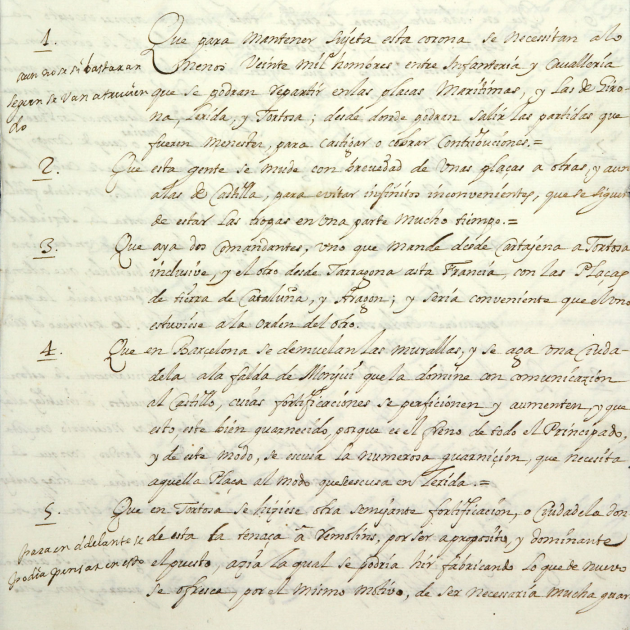 Finalment, recomanava enderrocar les muralles de Barcelona i la construcció de grans fortificacions militars a la capital catalana, a Lleida i a Tortosa; que per una banda justificava dient que “esto es el freno de todo el Principado” i per l’altra “se escusa (excusa) la numerosa guarnición que necessita aquella Plaça —referit a Barcelona— al modo que se escusa (excusa) en Lérida” i “que en Tortosa se hiziese otra semejante fortificación o ciudadela”. En el cas de Barcelona proposava la construcció a la falda de Montjuïc, amb connexió directa al castell, en el cas de Lleida no esmentava cap indret, i en cas de Tortosa, proposava Remolins “por ser apropiado y dominante el puesto”.