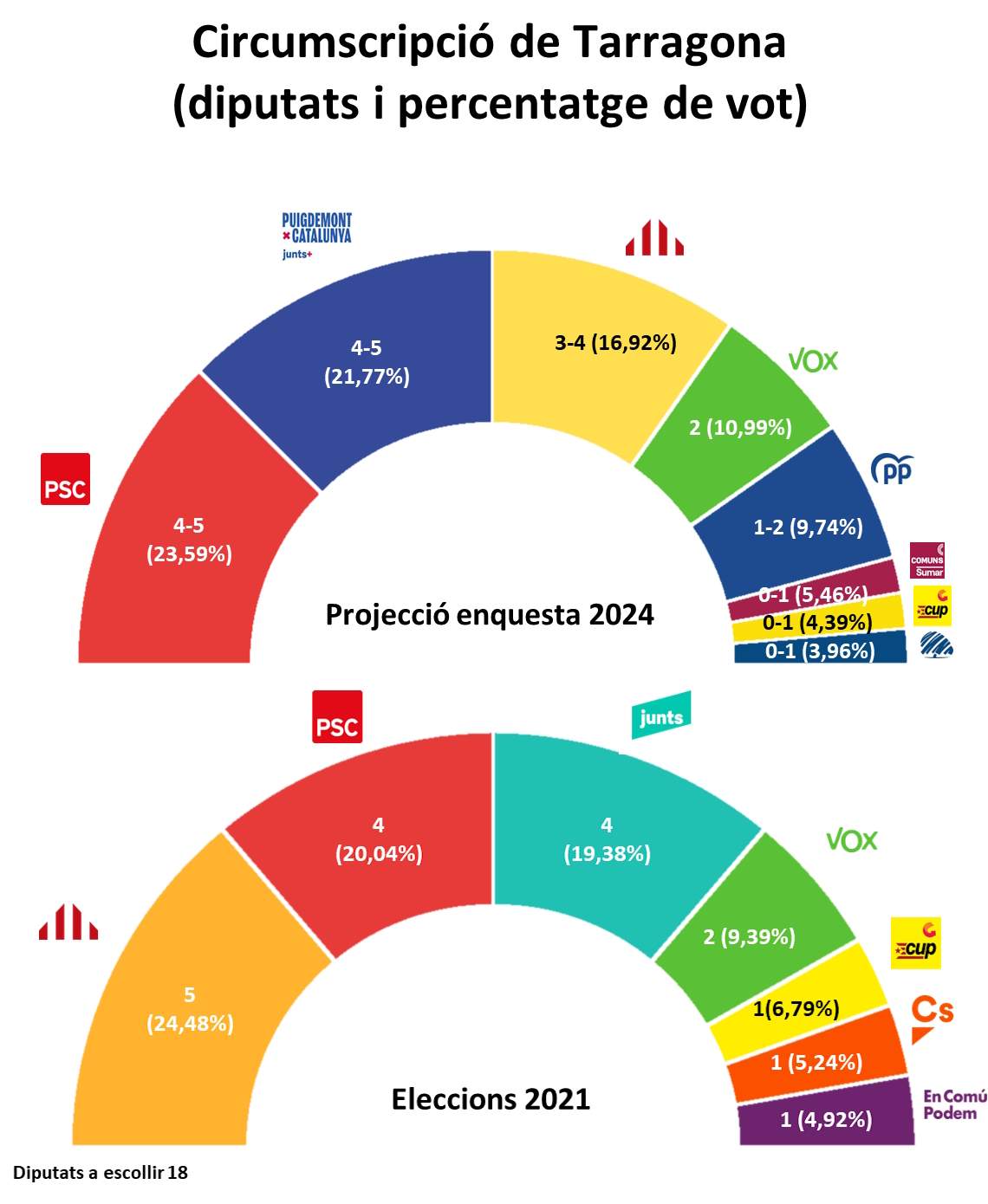 Finalment, el sondeig de Feedback encarregat per ElNacional.cat pronostica que a la demarcació de Tarragona s'imposi el PSC amb 6-5 diputats. Junts es quedaria amb 4-5 escons; ERC, amb 3-4; Vox, amb 2; PP, amb 1-2; Comuns, amb 0-1; CUP, amb 0-1; i Aliança Catalana, amb 0-1.