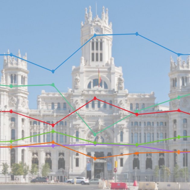 Per visualitzar l’evolució dels suports als diferents candidats a dirigir l’Ajuntament de Madrid, ElNacional.cat ha analitzat més d'una desena d’enquestes des del juliol del 2022. Totes les enquestes sense excepció donen una victòria al PP, i en tres dels sondejos el partit frega la majoria, superant el 40% dels vots.