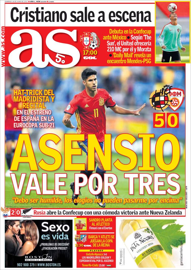 La selecció no va tenir pietat davant Macedònia en la seva estrena en l'Europeu sub21 disputat a Polònia. Els homes d'Alberto Celades van anar per feina i ja en la primera meitat guanyaven 3-0. En els segons quaranta-cinc minuts un gran Asensio, que va aconseguir un hat-trick, va sentenciar el matx marcant amb dos grans jugades.