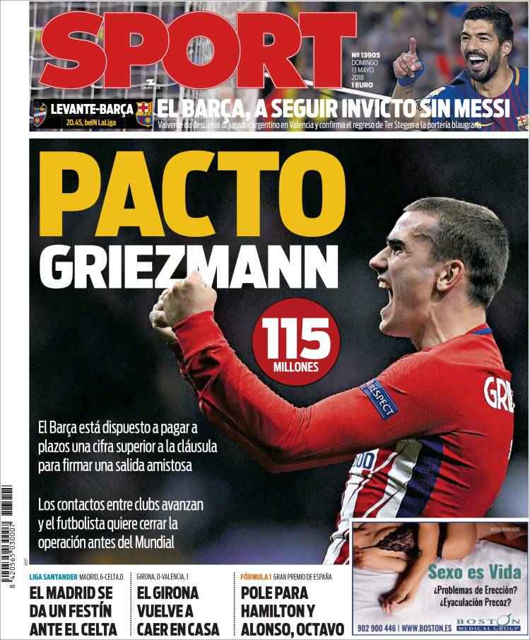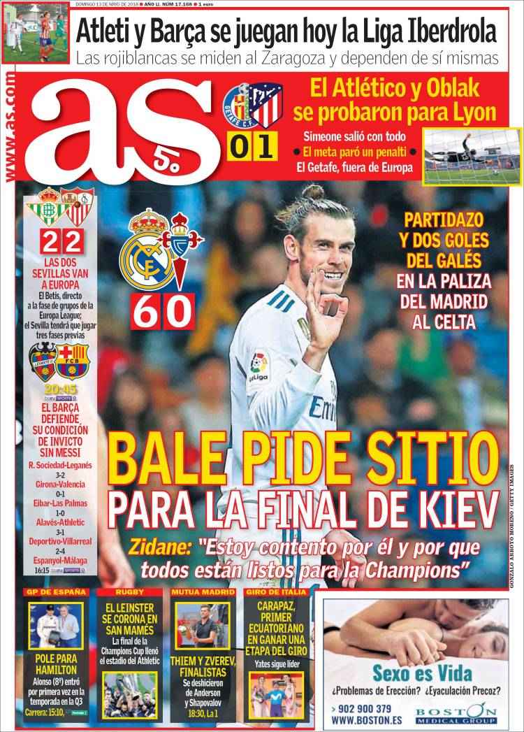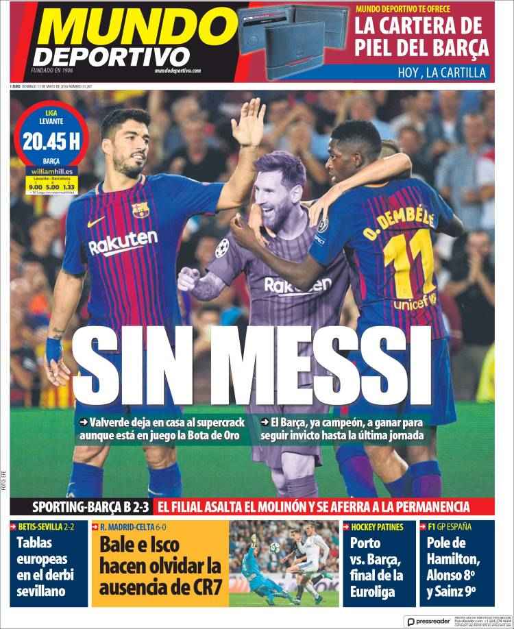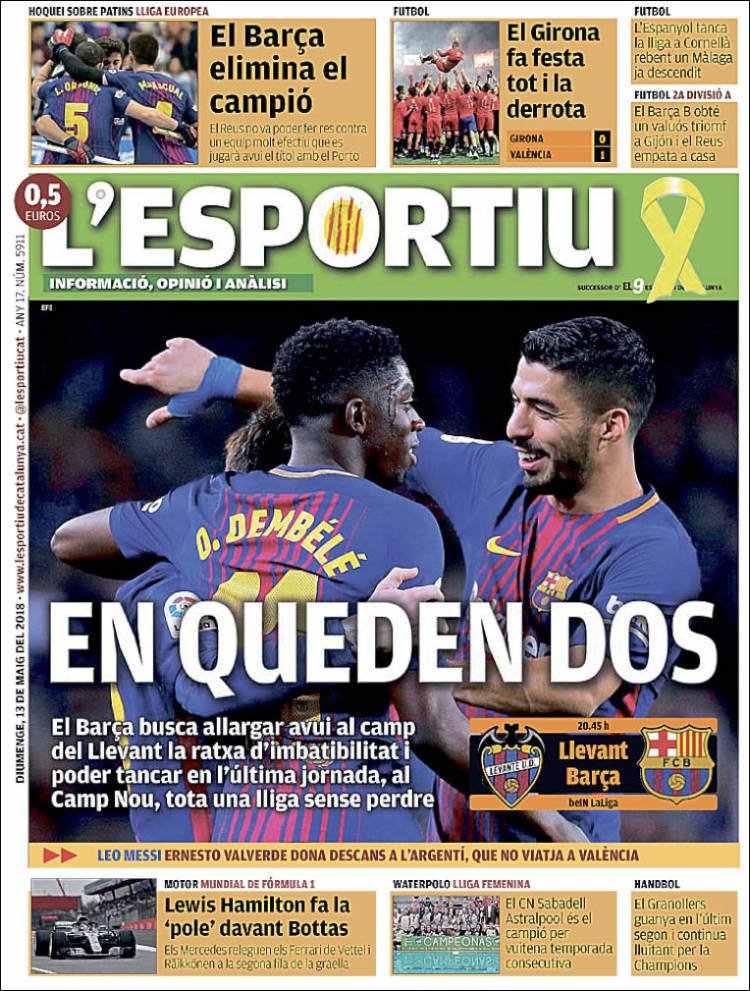 El partit d'aquest vespre del Barça a Llevant apareix en la primera pàgina dels diaris esportius de Barcelona. Els blaugrana, sense Leo Messi, buscaran arribar a l'última jornada de la Lliga conservant el rècord d'imbatibilitat. A Madrid, Gareth Bale ocupa les portades després de la golejada del Reial Madrid contra el Celta de Vigo.
