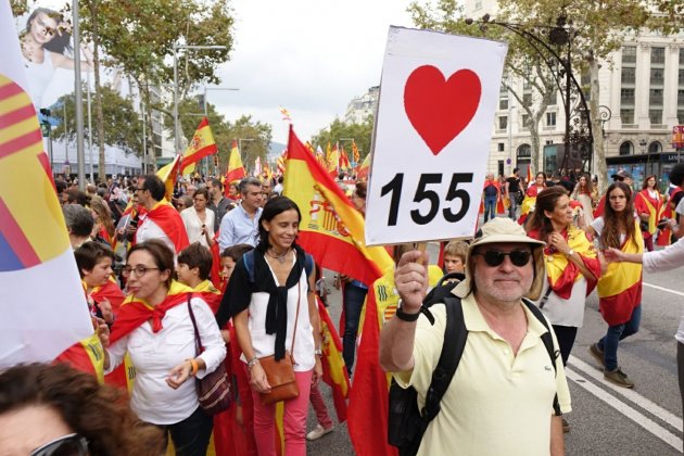 Un dels assistents a la manifestació unionista llueix un cartell on hi posa "Love 155"