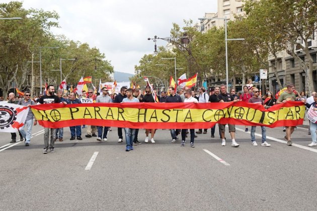 A la manifestació espanyolista d'aquest dijous a Barcelona s'hi poden veure lemes amenaçants, com aquest, que diu "No parar hasta conquistar". Les lletres 'O' tenen forma de creu cèltica, simbologia habitual dels grups feixistes i neonazis.