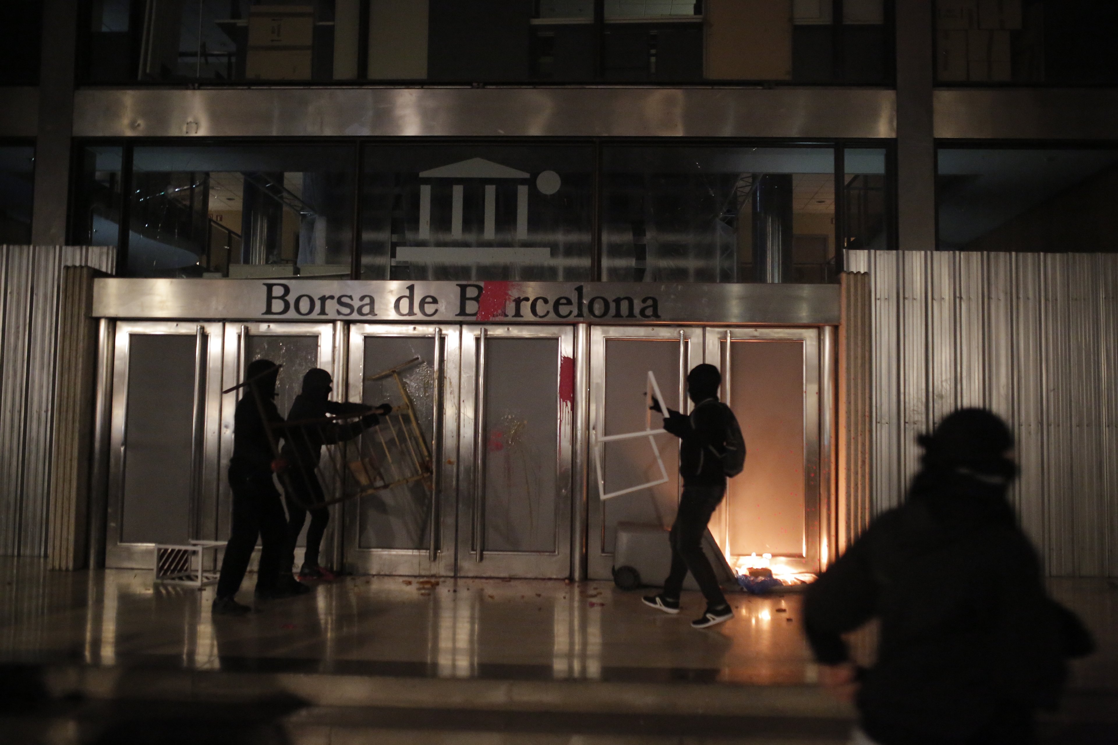 Alguns manifestants ataquen la Borsa de Barcelona.