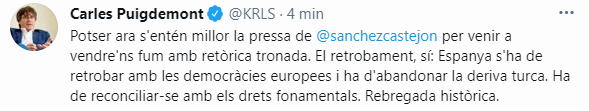 Rebregada històrica d'Europa a Espanya amb l'aprovació de l'informe al Consell d'Europa. El president a l'exili, Carles Puigdemont, ha reaccionat immediatament a la notícia a través del seu perfil de Twitter titllant el fet de "rebregada històrica" per l'Estat espanyol. "Espanya s'ha de retrobar amb les democràcies europees i ha d'abandonar la deriva turca. Ha de reconciliar-se amb els drets fonamentals", ha reclamat Puigdemont.