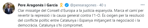 El president de la Generalitat de Catalunya, Pere Aragonèspresident de la Generalitat de Catalunya, Pere Aragonès, ha estat dels primers a reaccionar a l'aprovació al Consell d'Europa d'un informe que reclama l'alliberament dels líders independentistes empresonats per l'1-O i la retirada de les euroordres contra Carles Puigdemont i els exconsellers a Bèlgica. L'assemblea d'aquest organisme l'ha aprovat per 70 vots a favor i 28 en contra i 12 abstencions.