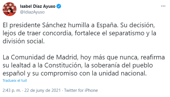 "El president Sánchez humilia Espanya". Díaz Ayuso ha acusat Sánchez d'"enfortir el separatisme" amb la concessió dels indults.