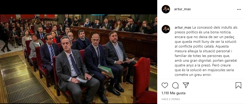 Artur Mas ha celebrat la decisió del govern espanyol de concedir els indults als presos polítics, però considera que no deixen de ser "un pedaç que queda molt lluny de ser la solució al conflicte polític català", que hauria de passar per l'amnistia.