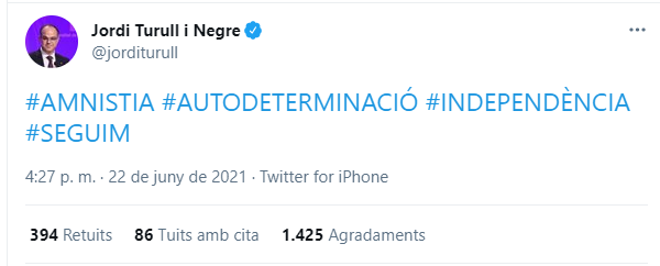 Jordi Turull també s'ha manifestat a Twitter després de la concessió dels indults per part del govern espanyol.