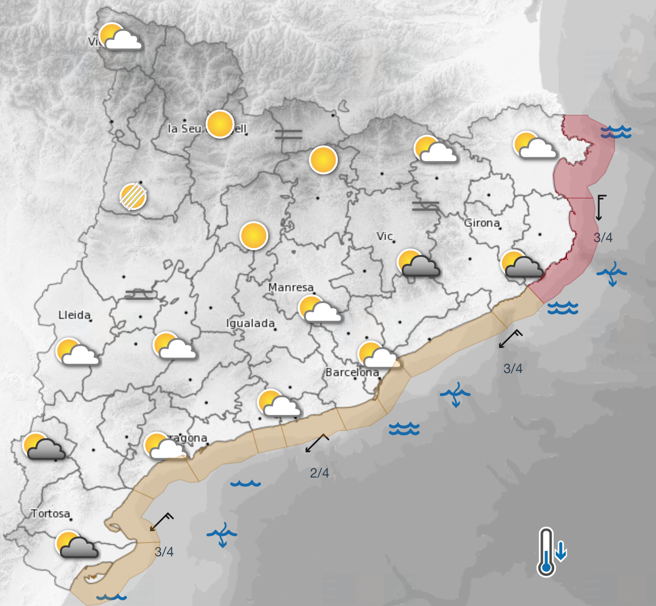 Temperatura mínima en descens entre lleuger i moderat. La màxima serà lleugerament més alta en general. La mínima es mourà entre 0 i 5 ºC al Pirineu i Prepirineu, entre 5 i 10 ºC a la depressió Central i prelitoral i entre 7 i 12 ºC al litoral. La màxima oscil·larà entre 11 i 16 ºC al Pirineu i Prepirineu, i entre 14 i 19 ºC a la resta.