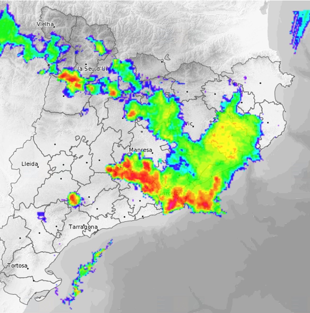 Ara mateix cauen perilloses tempestes i pedregades a l'Anoia, Vallès Occidental, Barcelonès i al Baix Llobregat. Alerta els habitants de l'Alt i Baix Penedès, Garraf, Alt Camp i nord de la Conca de Barberà on falten pocs minuts perquè hi arribin les fortíssimes tronades. Aquesta és l'última imatge del radar que mostra clarament la virulència de les precipitacions: