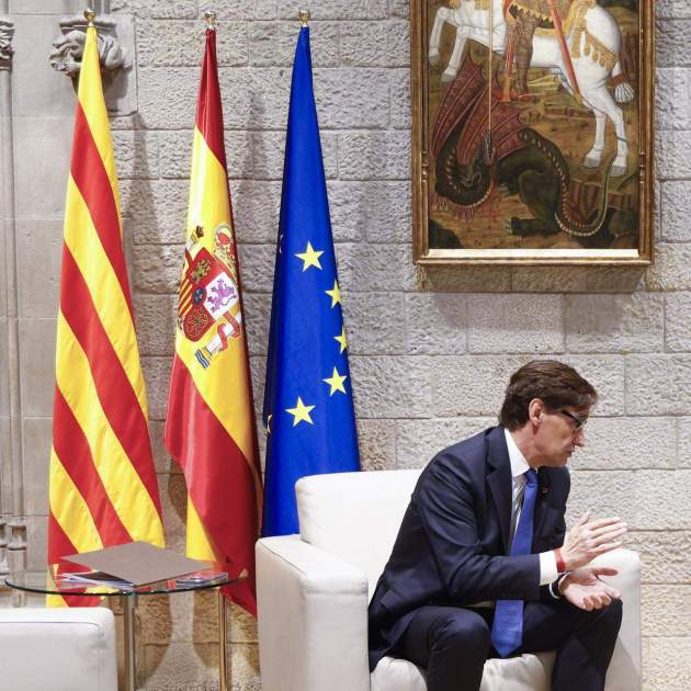 El president Salvador Illa ha instal·lat la bandera espanyola a la Sala de Diputats del Palau de la Generalitat, espai on els presidents es reuneixen habitualment amb els seus convidats. Així s'ha vist en la primera reunió que Illa ha mantingut aquest divendres amb l'alcalde de Barcelona, Jaume Collboni. Suposa un canvi important respecte dels seus predecessors, que només col·locaven la senyera i la bandera de la Unió Europea. Fins i tot el socialista José Montilla, segons una imatge d'hemeroteca, mantenia només la de Catalunya.