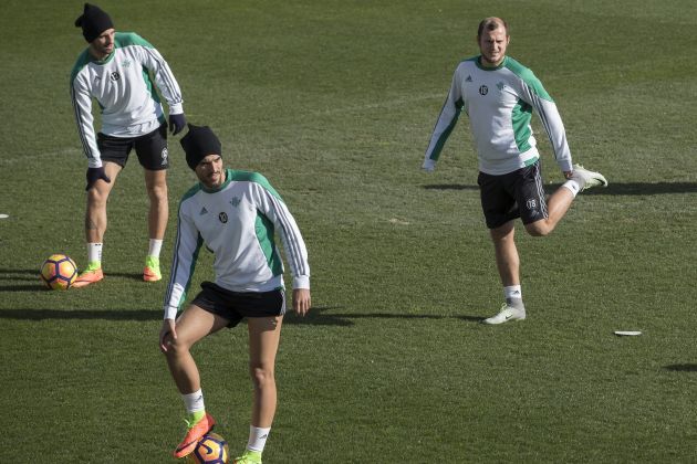 Zozulia, amb Ceballos i Piccini durant un dels seus entrenaments amb el Betis / EFE