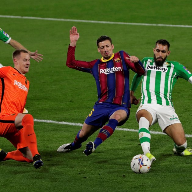 Imatge principal: Borja Iglesias, del Betis, intentant rematar davant de la pressió de Lenglet / EFE