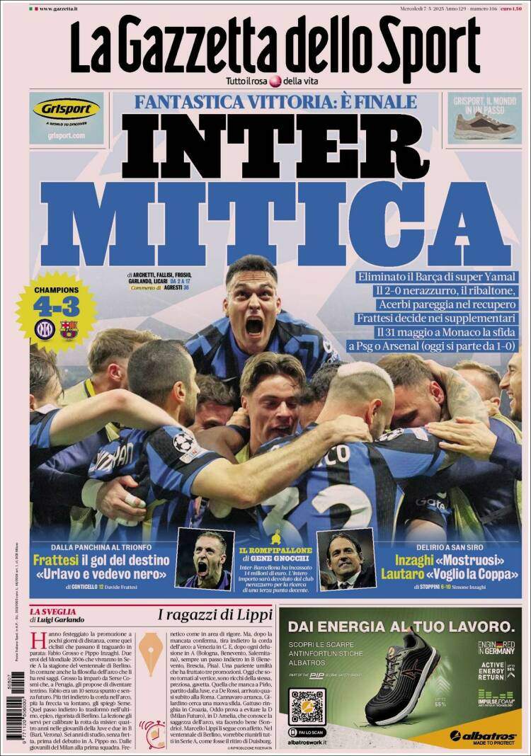 El que sí que està encara vibrant amb la victòria de l'Inter és La Gazzetta dello Sport. El diari esportiu de referència a Itàlia parla de la “Fantàstica victòria” i del “Mític Inter”. La celebració neroazzurri és protagonista. Ni una paraula de l'arbitratge, però sí que destaquen el “súper” Lamine Yamal.