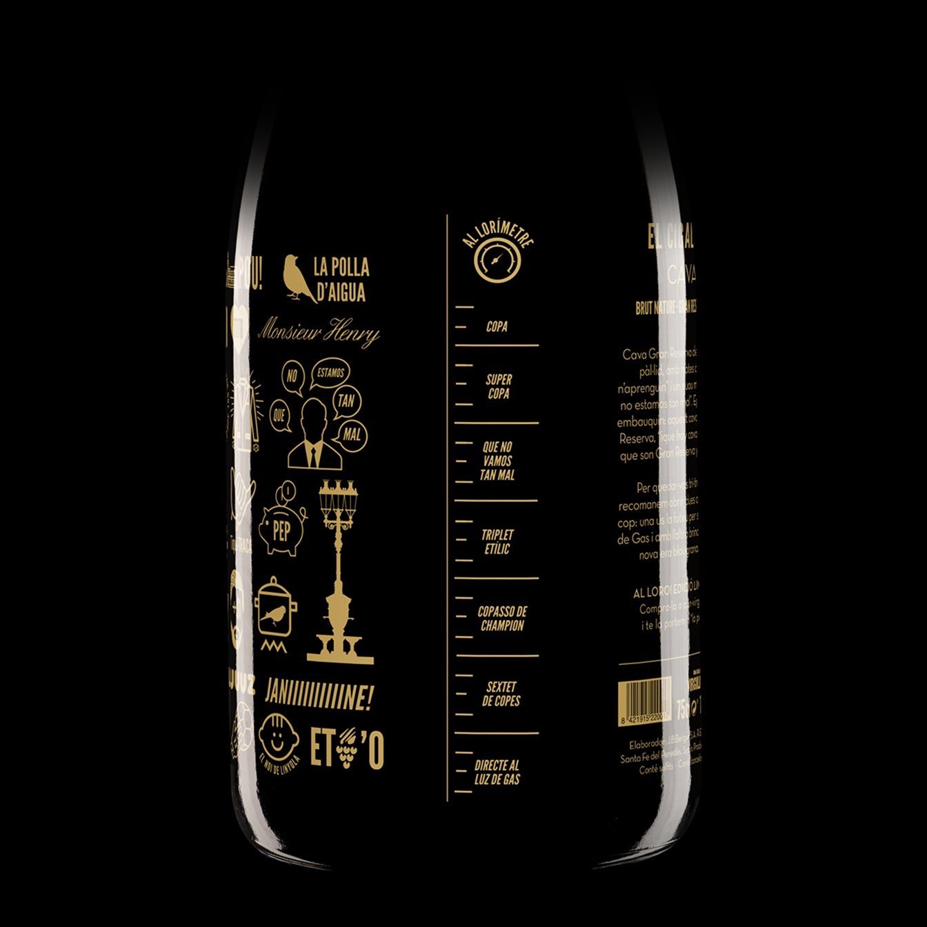 A més, en un lateral han creat l'"al lorímetre", que segons el celler servirà per "monitoritzar a temps real la teva eufòria blaugrana". A dalt del tot, amb l'ampolla pràcticament plena, apareix "copa", per anar baixant fins a arribar a "Directe al Luz de Gas", després de passar per "Que no estamos tan mal", "triplet etílic" o "Copasso de Champion".