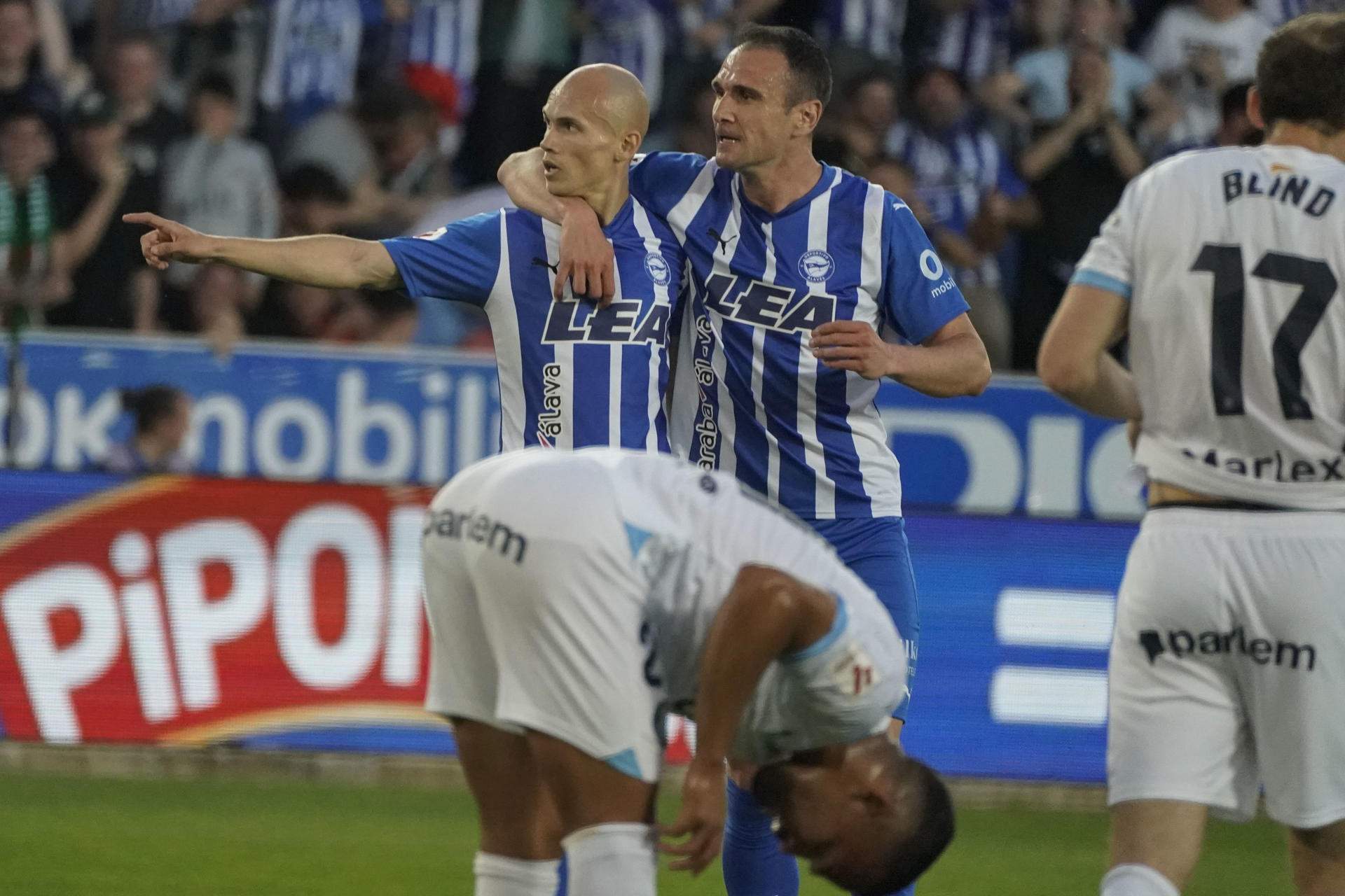 Marxarien Iván Martín, acabaria marxant Savinho i, sobretot, en una imatge preocupant, marxaria també coix Miguel Gutíerrez. En els minuts finals, l'Alabès s'ha sintonitzat amb la festa que es vivia a una graderia que celebrava la salvació i ha buscat l'empat. Ho ha intentat a través de terra, mar i aire, i encara que semblava que se li anava el partit, Guridi ha culminat el seu doblet per aiguar-li la festa al Girona.