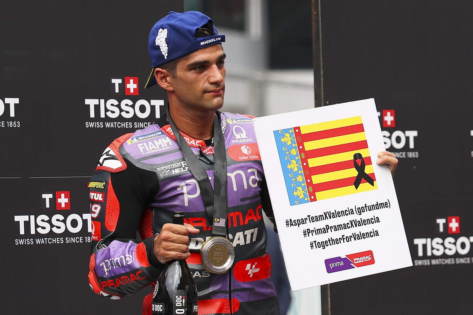 El de Prima Pramac Racing s'ha deixat el Mundial a punt de caramel, però no ha dubtat a recordar la terrible situació que travessa el País Valencià després del pas de la DANA. Per aquesta raó, ha volgut tenir un "petit detall per a València", confirmant que "donaré la bonificació (de victòria) d'avui" i explicant que "tot el que puguem aportar els pilots serà bo".