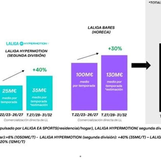 El valor total dels drets audiovisuals domèstics de LALIGA ascendirà a 6.135 milions d'euros en el cicle 2027/28-2031/32, cosa que suposa un creixement del 9% respecte al període anterior. Aquest avenç se sustenta en el notable rendiment de totes les categories addicionals als ja citats drets residencials: 30% en el segment HORECA, que passa de 500 a prop de 650 milions d'euros; un creixement del 40% en LALIGA HYPERMOTION, que eleva el seu valor de 125 a al voltant de 175 milions; i més de 60 milions derivats dels drets en obert i els resums i clips de vídeo, consolidant així la trajectòria de sostenibilitat i expansió del model de comercialització de LALIGA.