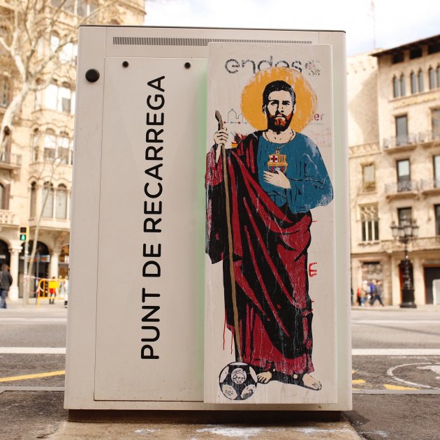 Al bell mig del Passeig de Gràcia ha trobat el mural ideal per representar l'argentí com un sant. Ell mateix li diu 'San Lionelus de Barcino'. I de fet la seva obra es troba sobre d'un subministrador de corrent elèctrica per a cotxes.