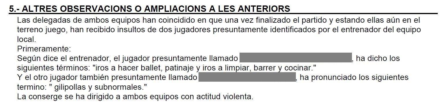 Els veterans dels dos equips no van cessar en els avisos i cada cop van anar a més. “Això és la llei del més fort", “saltarem al camp perquè som més forts”, “aneu a fer ballet”, “marxeu a la cuina”, “estúpides”, “imbècil”, “subnormal”, “boques”, cridaven. La gravetat era major perquè alguns dels insults anaven dirigits a futbolistes que eren menors d'edat. "Vam rebre burles, es reien de nosaltres i ens anaven comparant amb jugadors com Messi o Neymar per ridiculitzar-nos", assegurava a El Nacional una futbolista del Masnou.