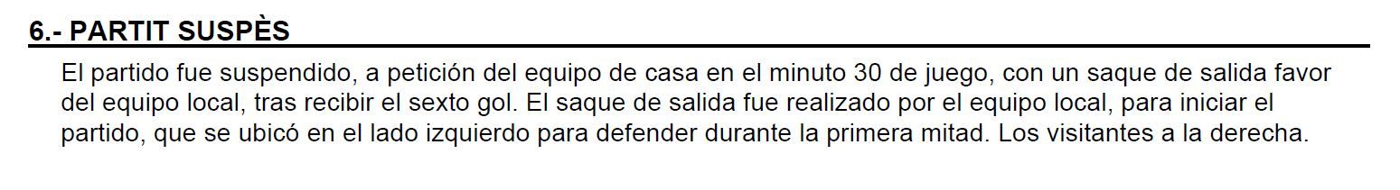 "Mai no havíem viscut una situació igual", assegurava una futbolista que va viure els fets en primera persona. A hores d'ara no hi ha res en ferm de com acabarà tot. L'acta del partit recull la suspensió amb el 0-6 al marcador, però el més probable és que acabi amb un 0-3 final i la decisió de deixar per finalitzat el polèmic partit de la discòrdia: primer ajornat i després suspès. A hores d'ara es desconeix si hi haurà algun nou pas per part dels dos equips femenins afectats o si s'interposarà alguna demanda.