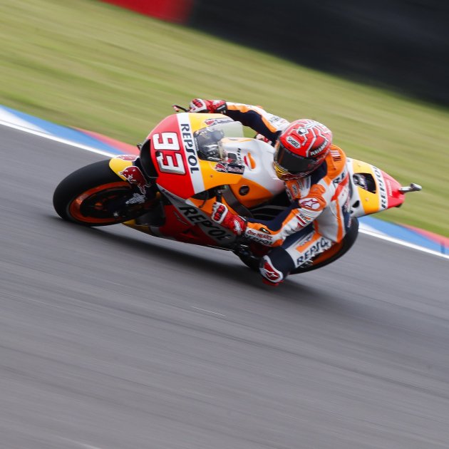 Márquez -que es destaca com el pilot amb major número de poles, 66, davant les 65 de l'espanyol Jorge Lorenzo i les 64 de l'italià Valentino Rossi-, ha marcat el millor temps aturant el cronòmetre en 1:47.512, en unes condicions mixtes. La pista no ha arribat a estar completament seca però Márquez ha superat en més de set dècimes a un sorprenent Karel Abraham, pilot d'una Ducati satèl·lit, i també al britànic Cal Crutchlow (Honda RC 213 V).