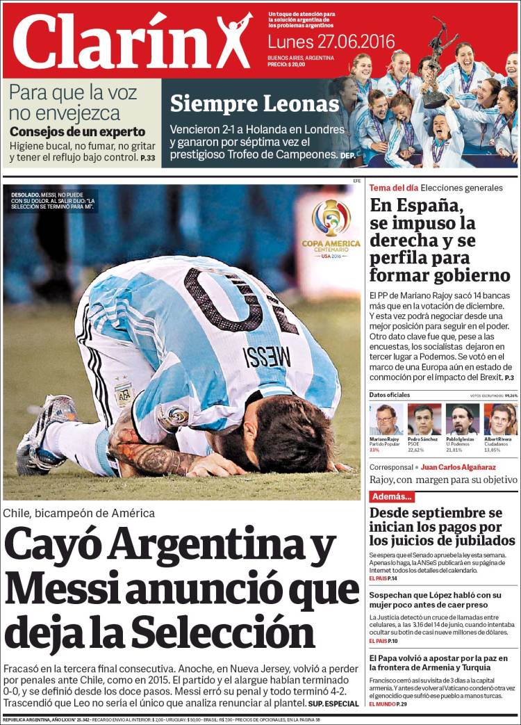 Argentina cau abatuda en una nova Copa Amèrica. Totes les portades se centren en la derrota contra Xile i ho enfoquen tot des del punt de vista de Leo Messi. Malson, frustració, decepció... són alguns dels qualificatius de la premsa d'Argentina.