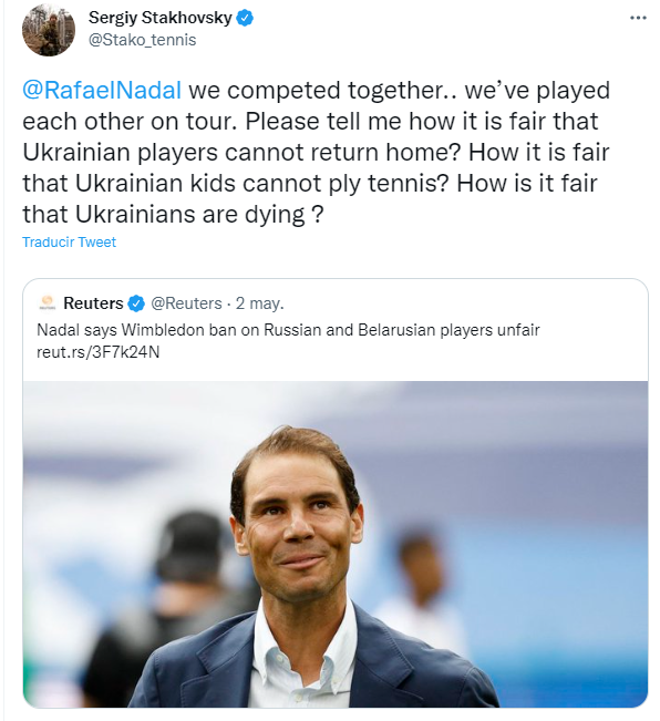 Stakhovsky ha volgut respondre a les paraules de Nadal, i ho ha fet de forma clara. "Competíem junts... ens hem enfrontat. Per favor, digueu-me si no és injust que els tennistes ucraïnesos no puguin tornar a casa, que els nens ucraïnesos no puguin jugar a tennis, i si és just que els ucraïnesos estiguin morint.", ha lamentat.