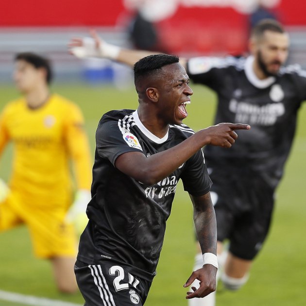 Imatge principal: Vinícius, celebrant el gol del Madrid, que ha arribat després d'un rebot afortunat / EFE