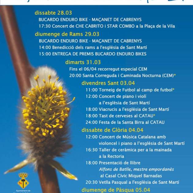 Recull de totes les diferents activitats programades per aquesta Setmana Santa al poble. Esport, música, cultura, etc.!