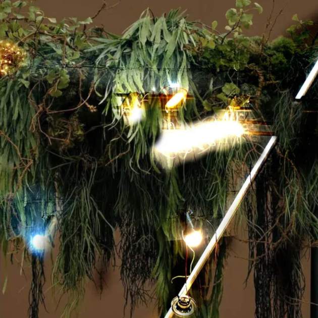 Instal·lació futurista. En un planeta ja sense presència de vida humana, la matèria vegetal i els sistemes electrònics en descomposició creen simbiosis i nous organismes. La natura i la tecnologia han engendrat una nova forma de vida, una criatura formada per arrels i cables corroïts que s’expandeix com un esquelet orgànic, que respira amb polsos elèctrics irregulars i dades oblidades, fragments d’un món que ja ningú no pot desxifrar. La instal·lació és una forma de vida posthumana. El testimoni d’un futur on la divisió entre allò natural i allò artificial s’ha dissolt per complet. En el silenci polsant, en la respiració elèctrica-vegetal, hi preserva la memòria d’un món desaparegut i la promesa d’una nova biologia feta de llum, circuit i arrel.