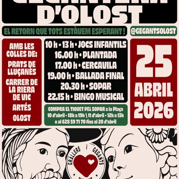 Durant tot el dia la plaça major d'Olost i els carrers més cèntrics acolliran la Trobada Gegantera d'Olost. De 10 a 13h hi haurà Jocs per la canalla, a les 16h Trobada Gegantera amb els Gegants d'Olost, els Gegants de Prats de Lluçanès, els Gegants del Carrer de la Riera de Vic i els Gegants d'Artés. A les 17h es farà una Cercavila pels carrers del poble, que arribarà a les 19h a la plaça. A les 20.30h es té previst fer un Sopar Geganter i completar-ho a les 22h amb un Bingo Musical.