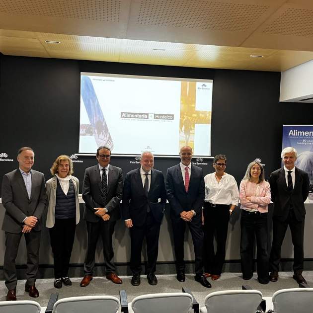 Els responsables de la fira Alimentaria+Hostelco han presentat aquest matí les principals novetats de l'aparador més important de l'Estat de la indústria alimentària. Maria Naranjo, directora d'Indústria Alimentària de l'ICEX; Pere Taberner, director d'Hostelco; Constantí Serrallonga, director general de Fira de Barcelona; Antoni Llorens, president d'Alimentaria; Anna Canal, directora d'Alimentaria i Ignacio Silva, president de la FIAB, han detallat les xifres i les novetats de l'edició d'enguany.