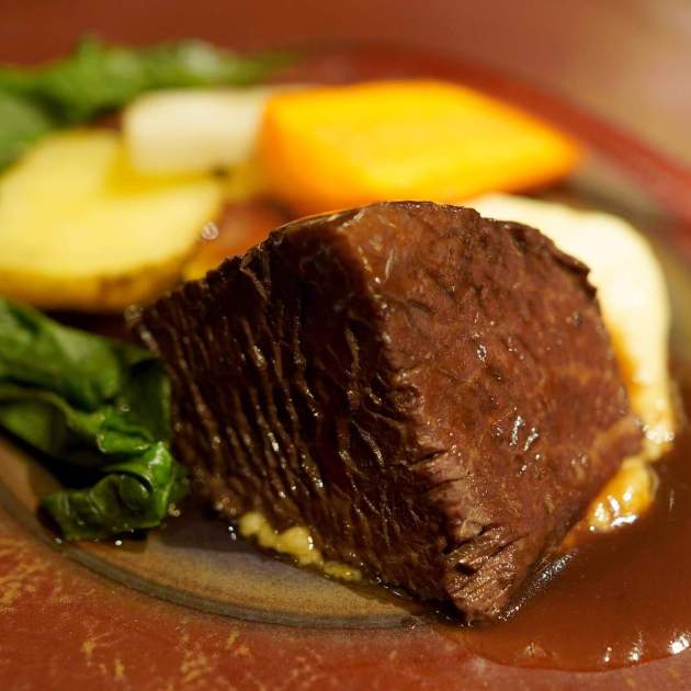 Finalment, es talla la carn a trossos d'aproximadament deu centímetres i es col·loca en una safata de forn. S'enriqueix la salsa amb una mica de mantega, es cobreix la carn amb aquesta reducció i s'enforna a 200 graus durant quinze minuts. El resultat és un melós de vedella amb una textura increïblement tendra, embolicat en una salsa untuosa i plena de sabor, llest per servir com en els restaurants més exclusius.