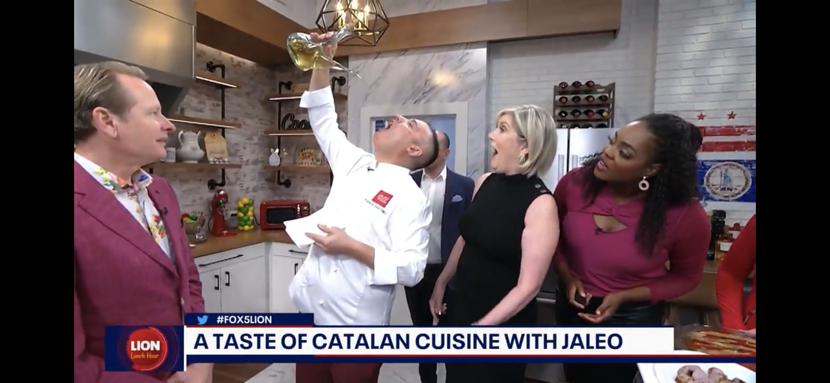 També a la capital americana, i en el marc de la Catalan Gastronomic Week, el xef català Ramon Martínez, i el sommelier Jordi Paronella, representants dels restaurants Jaleo d’en José Andrés), han aparegut a la pantalla del mitjà local FOX 5, per explicar a la nació qui són els catalans, què mengen i què beuen. L’equip televisiu s’ha fet un tip de calçots, ha après a beure en porró, i s’ha amarat de cultura catalana. Gràcies, Jaleo!.