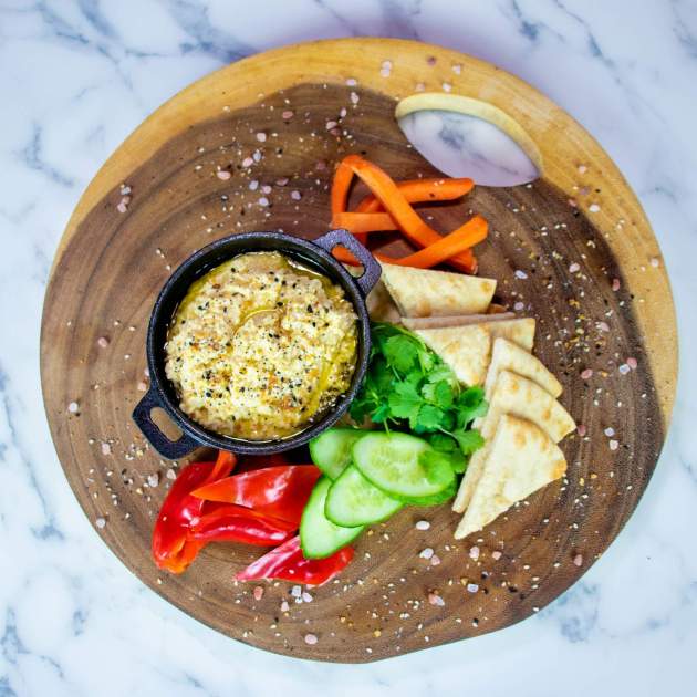 L'acompanyament ideal són els clàssics crudités, és a dir, verdures crues tallades en bastons. En aquest cas s'utilitzen pastanagues i api, que aporten un contrast perfecte gràcies a la seva textura cruixent, frescor natural i sabor lleugerament dolç. Aquestes verdures no només equilibren la intensitat de l'hummus, sinó que també converteixen el conjunt en un picoteig lleuger i molt saludable.
