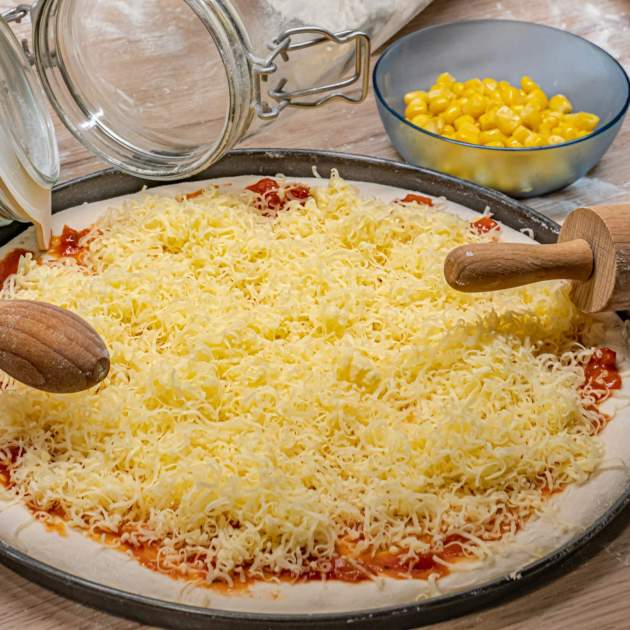 Quan la base està a punt arriba la part més reconeixible del plat. Sobre la superfície s'hi afegeix salsa de pizza o tomàquet triturat, més mozzarella ratllada i, si es desitja, una mica d'orenga per aportar aroma. En aquest punt la recepta torna al forn uns 10 minuts més, just el temps necessari perquè el formatge es fongui i la pizza quedi sucosa per sobre. El resultat final recorda molt una pizza tradicional, tot i que amb una composició nutricional molt diferent.