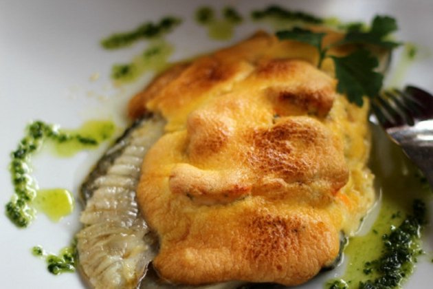 És una recepta senzilla per fer i amb un resultat deliciós i sorprenent. Els ingredients per a 2 persones són 2 lloms de turbot, cues de gamba, 1 gra d'all, julivert, maionesa, 50 ml d'oli d'oliva verge extra i sal. L'elaboració del plat són 20 minuts. Col·locar els dos lloms de turbot amb la pell cap avall al forn, sobre un parell de cullerades d'oli d'oliva. Mentre s'escalfa el forn a 190 °C, preparar un oli d'all i julivert triturant un gra d'all, les branques de julivert i 50 ml d'oli d'oliva. Pelar les gambes i saltar-les amb tres cullerades o quatre de l'oli d'all i julivert en una paella, tenint cura perquè les gambes no es cuinin massa.