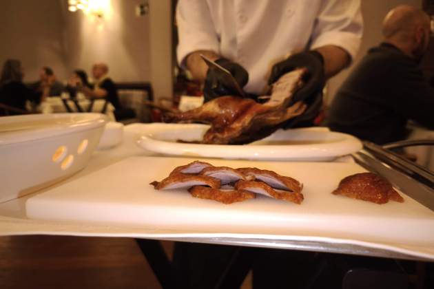 Per acabar els salats, un ànec Imperial Beijing, sencer, entre dues persones, perquè quan una cosa està tant bona no perilla atipar-se massa. Arriba un cambrer que es nota que ha emplatat centenars d'ànecs en aquesta vida perquè l'especeja amb una facilitat admirable. Menjar ànec Beijing és tot un ritual: s'agafa una petita crep i s'hi posa una mica de salsa hoisin que és a base de soja fermentada, s'hi posa damunt una mica de cogombre i ceba xinesa, i s'acaba amb un parell o tres de trossos de l'ànec. S'enrotlla (amb més o menys traça) i cap dins! L'ànec té la pell cruixent i és tendre i sucós, i com més s'acosta la carn a la zona de la cua, més greixosa, és per això que et recomanen empolvorar una mica de sucre a la crep quan es mengen els talls de carn d'aquesta zona. L'ànec Imperial Beijing és una delicadesa que s'ha de tastar tant sí com no si es ve al China Crown.