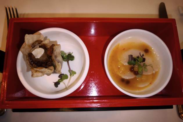 Comencem amb dos platets d'aquests per menjar amb dues cullerades (o amb dos intents de bastonets xinesos). Primer unes originals vieires marinades amb suc de llima, all, gingebre, coriandre i bitxo de Hunan, una província muntanyosa del sud de la Xina, que si busqueu les fotografies a Google tindreu la necessitat de visitar-la, i uns saquets d'ànec amb crudités de verdures. Només us diré que després de tastar aquest ànec, tindreu la necessitat de tastar més plats amb aquesta carn. Arriben els dumplings —o gyozes o crestes japoneses: el primer és un xiaolongbao imperial farcit de shiitake i verdures selectes, el preferit, que per qui no ho sàpiga, el shiitake és un bolet asiàtic que té una textura que pot recordar a la carn. Tastem també un xiaolongbao de secret ibèric amb foie, que qui em coneix sap que tot el que porti foie i trufa m'encanta, i un Ku Chai Kuih, que és una altra varietat de cresta xinesa, fet de pasta d'arròs i farcit de gambes i cibulet xinès.