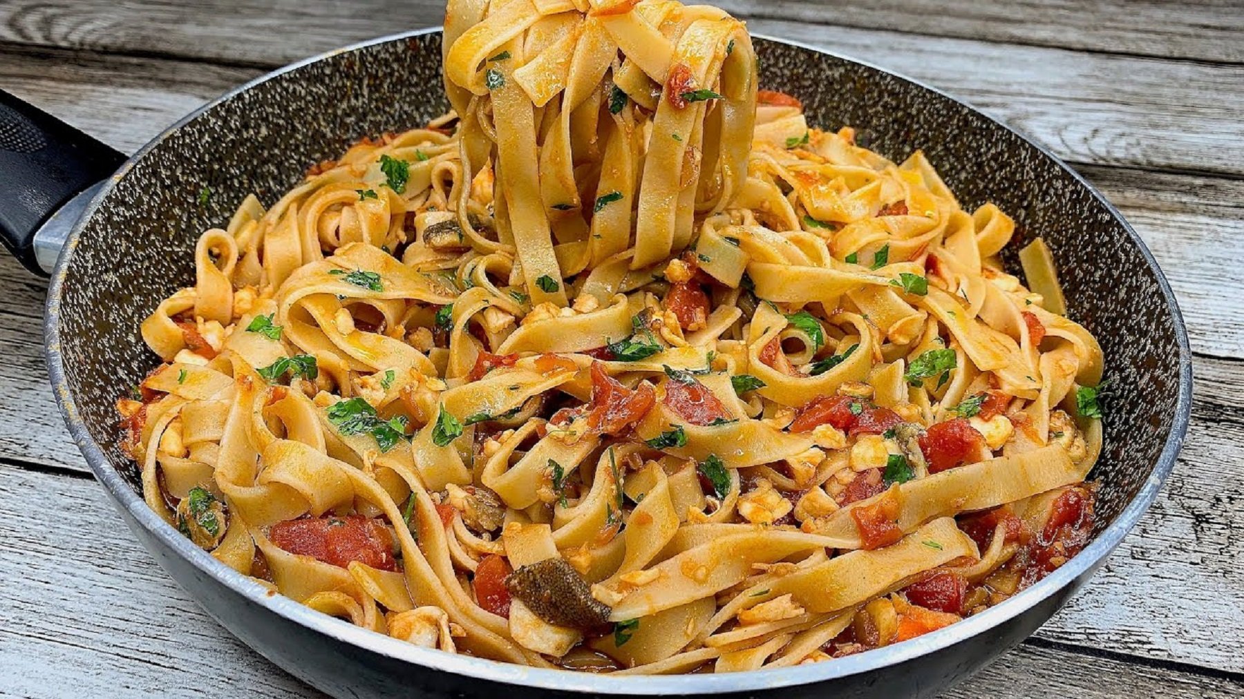 En una paella posem els xerris rostits i les verdures escabetxades. Encenem el foc i fem que prengui temperatura i el tomàquet redueixi lleugerament l’aigua, uns cinc minuts. Mentrestant bullim la pasta en una olla amb força aigua amb sal, el temps que el fabricant indiqui. Quan sigui cuita, la passem a la paella arrossegant un cullerot de l’aigua de la cocció. Sacsegem per tal que tot s’integri. Salpebrem. Acabem amb el formatge ratllat.