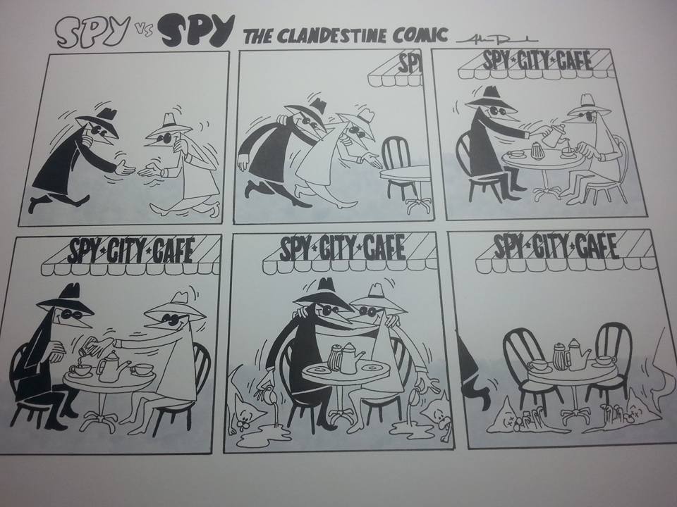 Spy vs. Spy és una historieta protagonitzada per dos atziacs espies estereotipics (barret, gavardina, ulleres de sol) l’un rigorosament vestit de blanc, l’altre de negre, però fora d’això pastats, bessons, gairebé simètrics i igual de calamitosos. Ambdós tenen per missió acabar l’un amb l’altre. L’efecte còmic resulta dels fracassos de tots dos agents quan els seus malèfics plans es rebel·len contra ells mateixos, de manera que els dos guanyen i perden alhora. En aquest tebeo no hi ha cap fumet ni bocadillo (curiós que, tant en català com en castellà, l'espai que recull el text en una vinyeta adopti noms gastronòmics), de manera que s’anul·la tota possibilitat de diàleg. Encara que els hi pugui semblar, no es tracta de cap sàtira en dibuixos del CatalanGate i les desconcertants acusacions d’espionatge del mateix govern espanyol, sinó d’una paròdia de les ideologies enfrontades durant la Guerra Freda publicada a les pàgines de MAD. Nota per malfiats: «MAD» no és només l’abreviatura de «los Madriles», també refereix al nom d’una degana revista nord-americana que fa befa de l’American way of life i els seus productes de consum, menjar ràpid inclòs. Les desventures dels dos espies enfrontats van néixer del plomí d’Antonio Prohías (1921-1998), un caricaturista polític cubà que s’exilià a Nova York quan Fidel Castro va acusar-lo de treballar per a la CIA. Prohías, sorneguer, signava subreptíciament les seves tires còmiques amb la seqüència del seu nom en codi Morse. «La venjança més dolça ha estat convertir l'acusació d’espionatge de Fidel sobre mi en una manera de guanyar diners», declarà el ninotaire. Després que l’autor es retirés per motius de salut, altres dibuixants han continuat la saga, estesa a videojocs i sèries d’animació, i el camp de batalla dels antagònics a l’una que idèntics espies han estat sovint els restaurants. O bé les seves explosives trampes han tingut al menjar com a esquer.