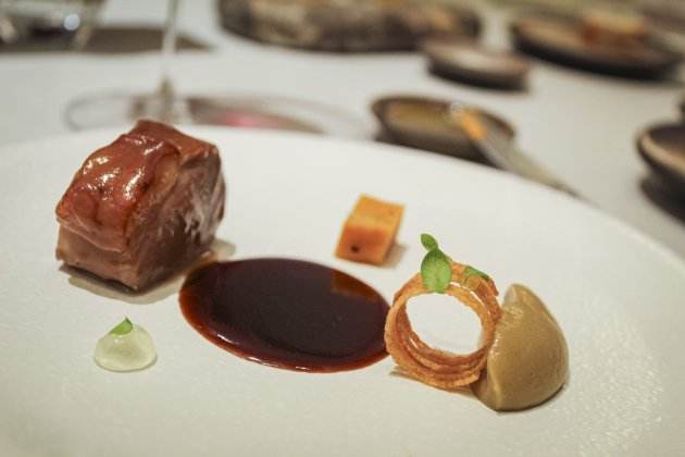 La Carla contraataca amb un blanc d’Alsàcia, un Léon Beyer del 2014 100% pinot gris, per regar l’escuma de coliflor, txangurro i gelée de musclos amb herbes fresques. Continuem amb un dels plats preferits dels xefs, el calamar amb pil-pil de bacallà i algues escabetxades, unes boletes de tempura per fer la sensació de cruixent amb una mica de caviar. No m’estranya gens que sigui el seu plat preferit, ho remullem amb un Muchada-Léclapart d’Andalusia, un vi ecològic, natural i biodinàmic servit en copa ampla perquè s’airegi una mica, molt interessant.