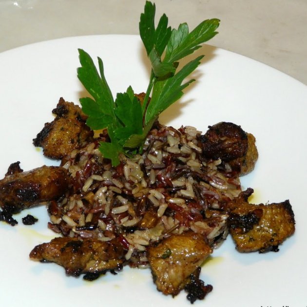 Avui he aprofitat uns pinxos moruns que ja tenia preparats en adob de Ras el Hanout per a presentar un plat amb una mica d'arròs salvatge, que m'agrada molt. De fet és una barreja de tres arrossos salvatges.
