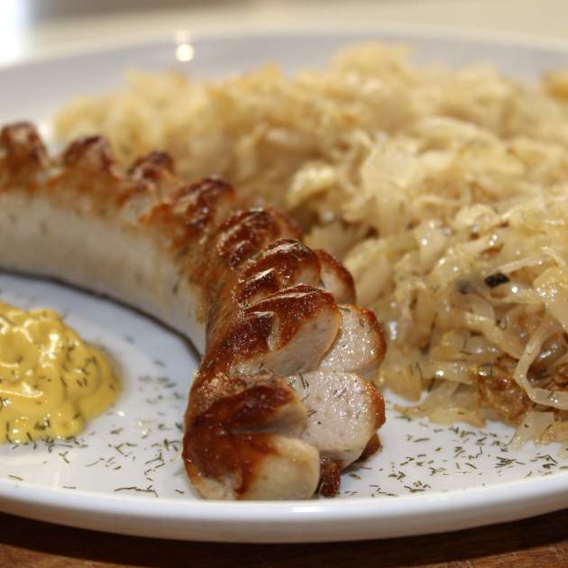 Jo he preparat aquesta salsitxa alsaciana amb mostassa i xucrut, amanit amb una mica d'anet.