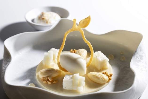 Es comença al mar, amb una seqüència d’ostres brillant, i s’acaba a la muntanya, saltant de plaer amb el cabirol. Entremig: croissant, mantega i caviar; una reinterpretació a la gallega de pop i calamar, una joia en forma de gambetes amb sucs d’espàrrec blanc i maduixes; el mític milfulls de foie gras i anguila fumada, amb cibulet i poma, amb nous aires; un risotto fresc de col llombarda i peix virrei a la brasa, un cant al mar acompanyat de la profundidat d’una crema d’arrels, de trufa, de cirera amarena i d’una reducció de nècora a l’anís.